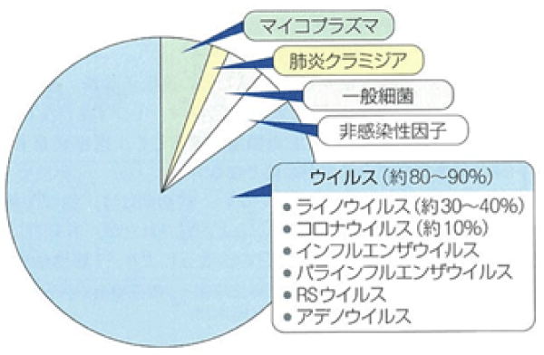 原因の7―8割がウイルスである。ウイルスの種類として最多となるのは普通感冒と言われるライノウイルス、冬季に最多となるコロナウイルス、プール熱を引き起こすアデノウイルス等が挙げられる。感染の経路により空気感染、飛沫感染、接触感染の3種類に分かれる。