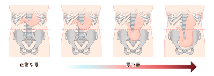 胃が正常な位置よりも垂れ下がっている状態をいう。重症になると、骨盤の位置まで胃が落ち込むこともあるとされる疾患。さまざまな腹部症状を訴える方がいる一方、無症状の場合もあり、特有の症状がないことなどから、西洋医学では病気として扱われない場合も多くある。